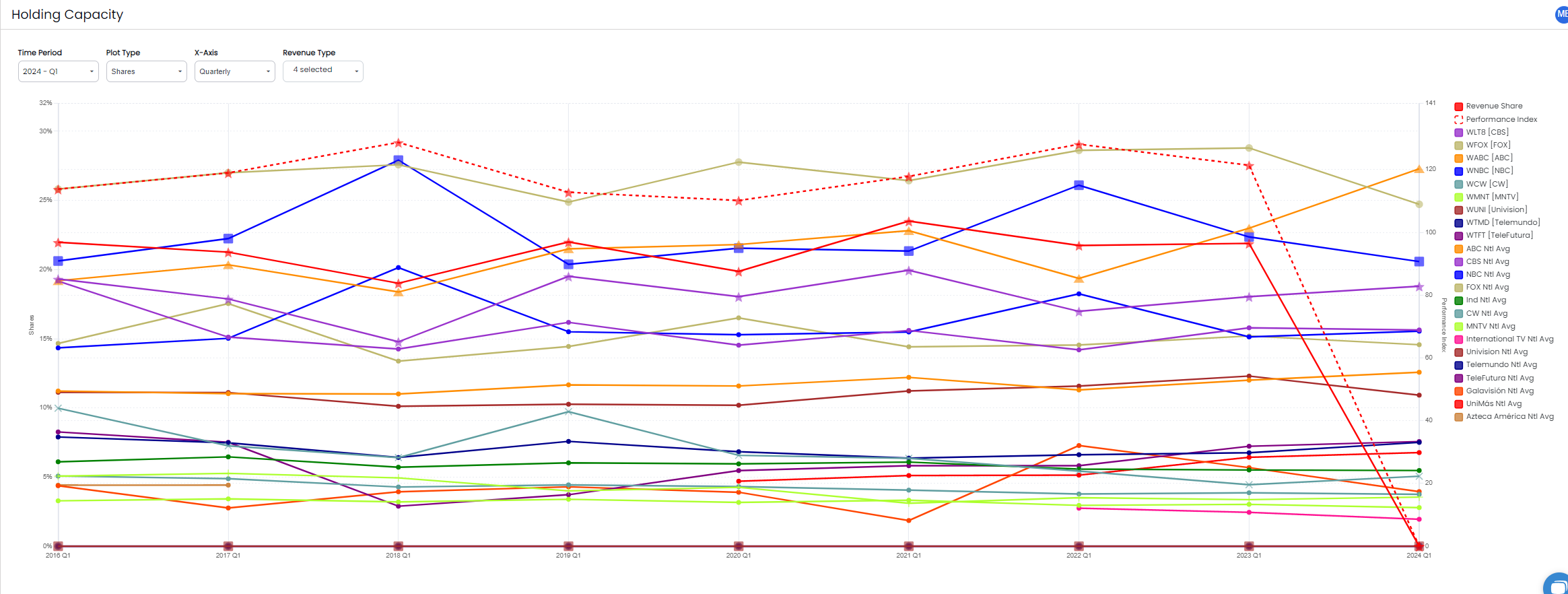 Holding Capacity is a measurement of your station’s ability to hold revenue share within your market. It’s used to understand how your performance compares to what your station is “expected” to earn, often through a lens like cost per rating point (CPP/CPRP) or cost per impression point.